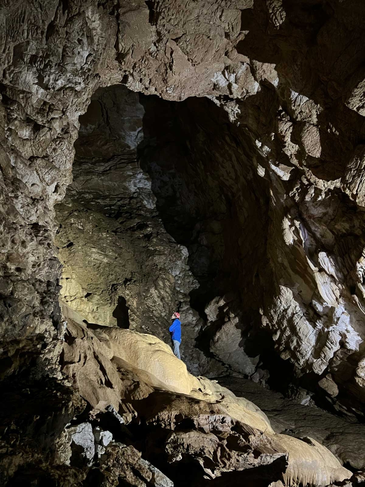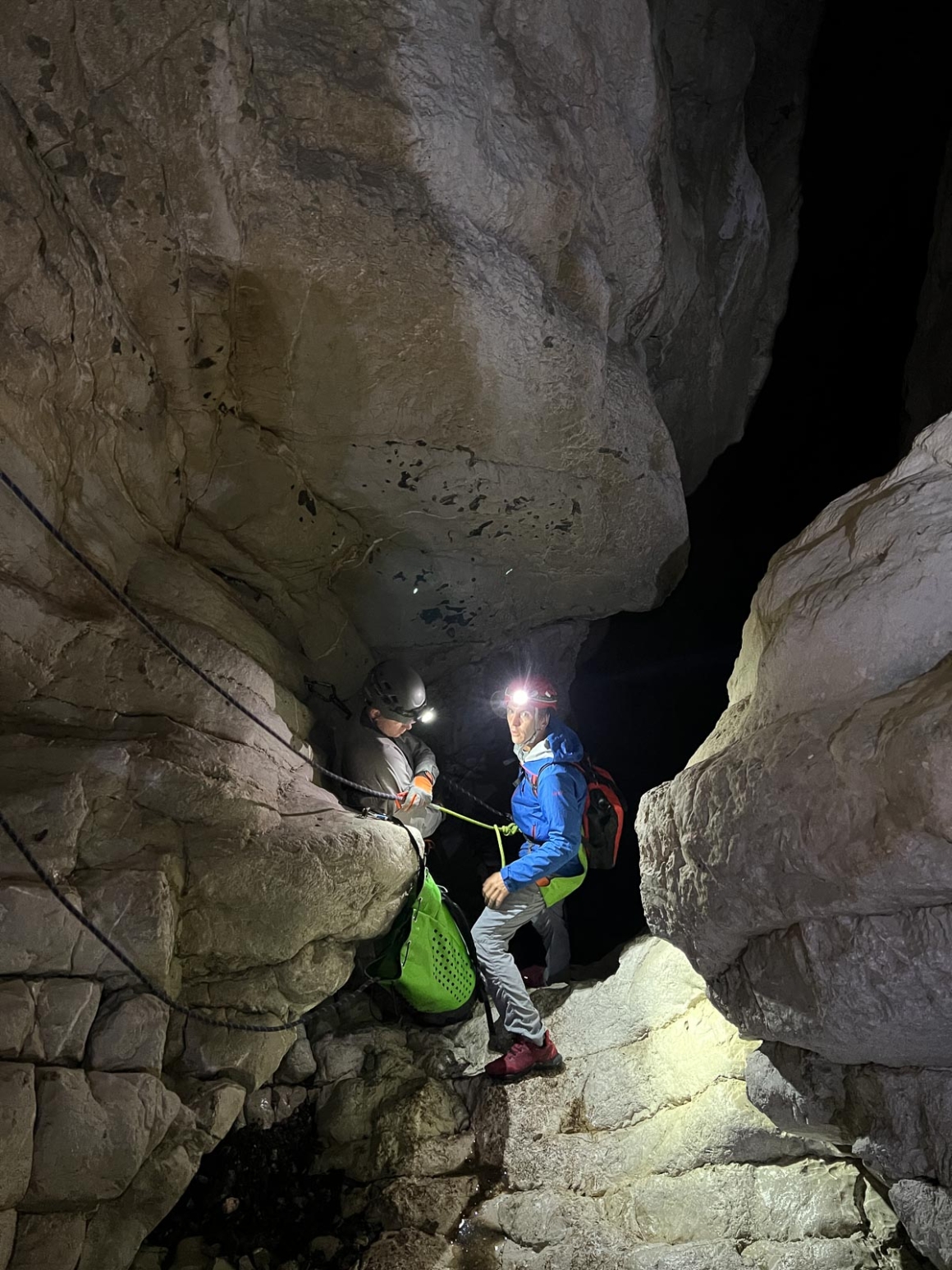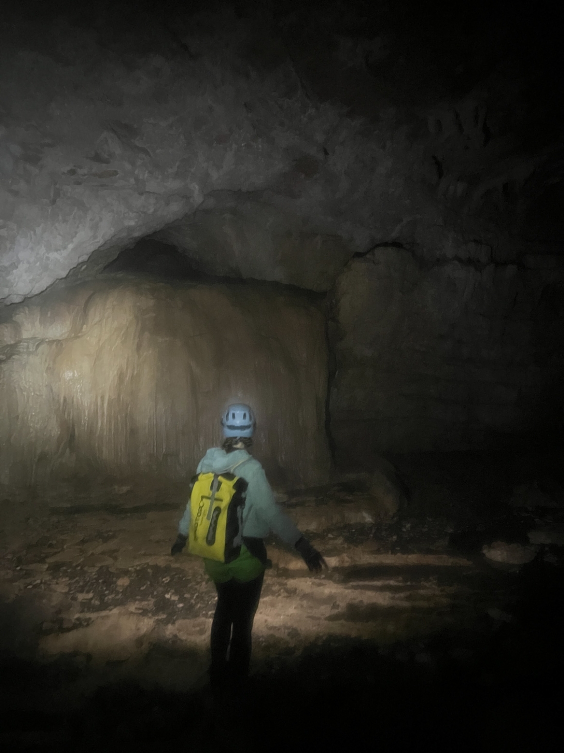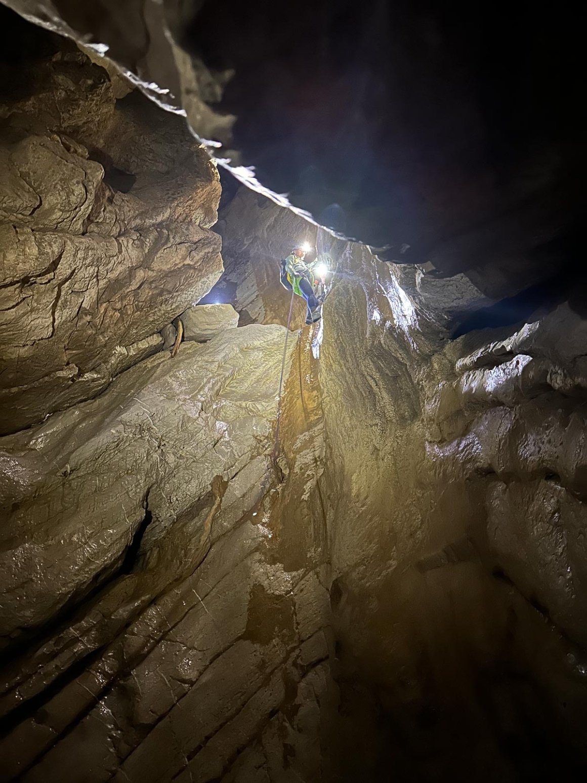 Проходим пещерный каньон (≈ 2,5-3 ч). Маршрут спускается в глубь пещеры через сеть пересохших водопадов и залов. Маршрут сухой, здесь не нужно плыть, но после первого дюльфера обычно есть большая лужа глубиной по колено, которую в сухую погоду можно обойти. В пещере испачкается одежда и обувь.
