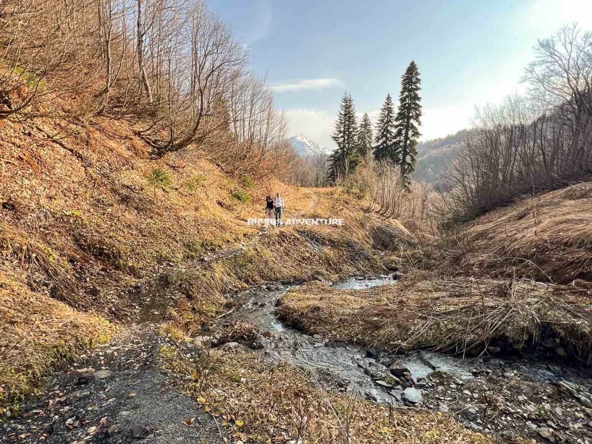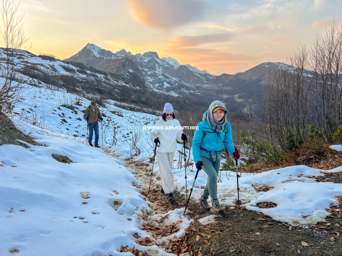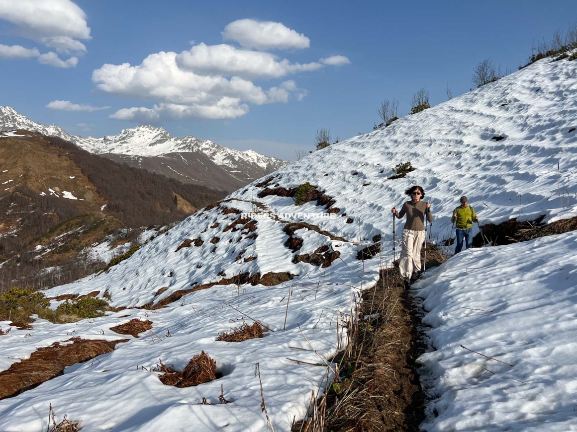 Поход начинаем на высоте 1550 м и около 1,5 часов (по расстоянию 2,5 км) поднимаемся по лесу до зоны альпийских лугов, тропа широкая и комфортная. Затем с небольшим набором высоты идем около по верху хребта с панорамным видом на о. Рица, г. Анчхо, Семиозерье, долину Ауадхара и г. Кардывач.