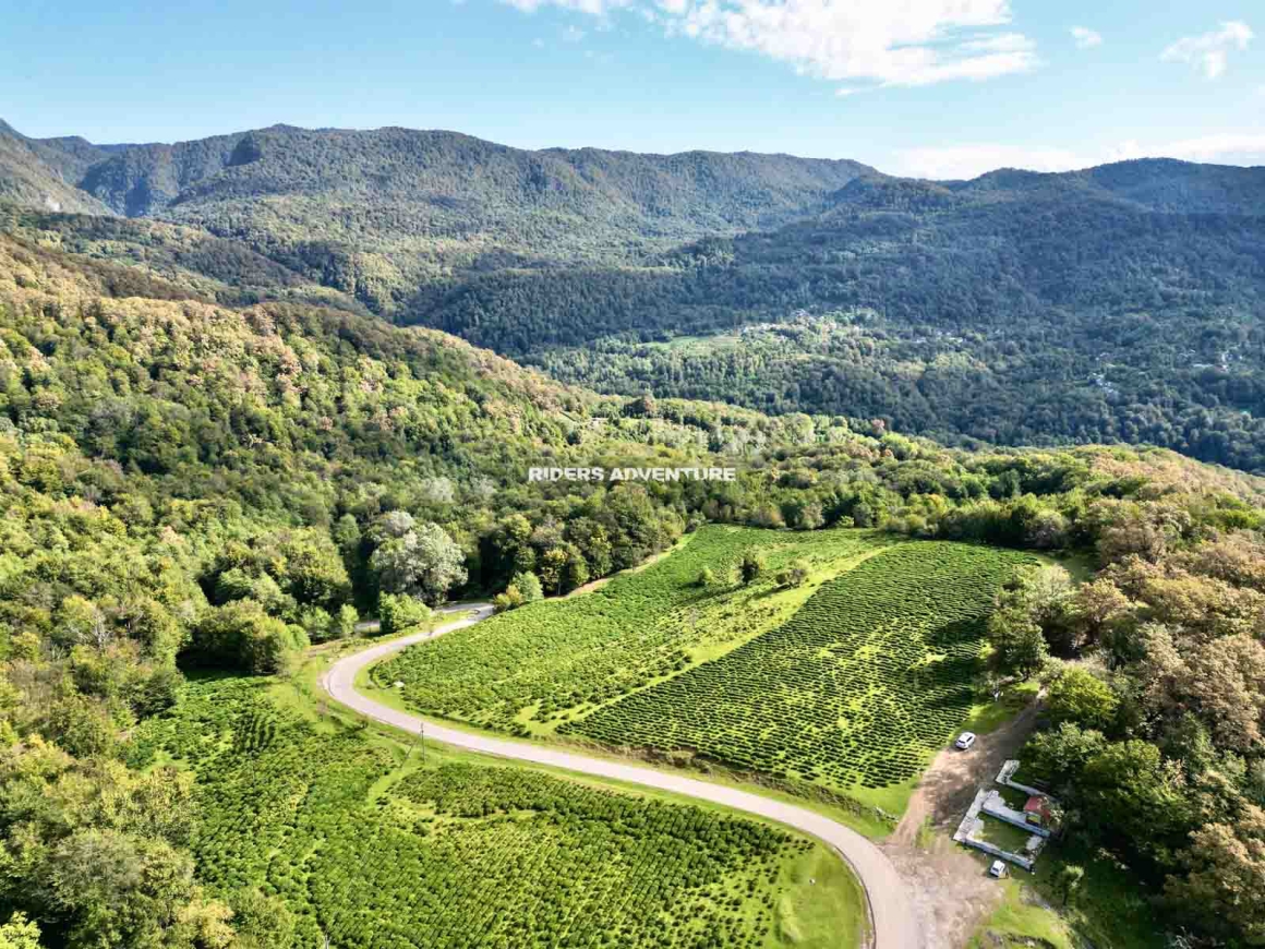 Возвращаемся через Хостинские чайные плантации, стройные ряды и живописный вид на долину, окруженную горами.